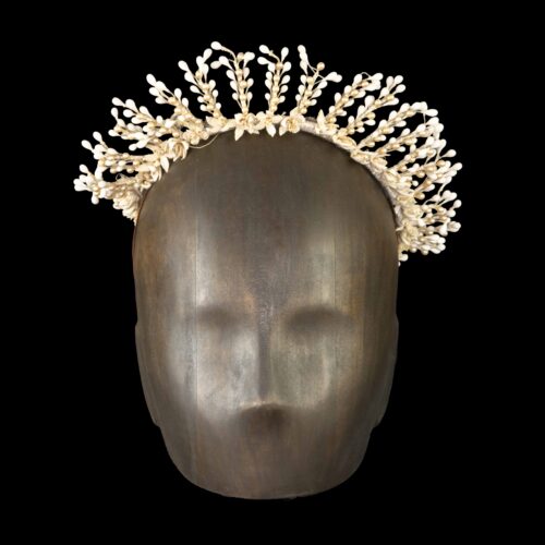 Elle est montée sur une armature ronde en laiton, prolongée d’épis en ordre croissant, le tout recouvert de fil de soie couleur naturelle. La base est ornée de petites fleurs d’oranger blanches aux pétales en toile de coton trempée dans la cire et au coeur en ruban bruyère. De chaque fleur, part un épi avec des boutons nacrés et des boutons enrobés de cire naturelle blanche. Élastique de maintien.