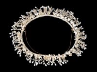 La couronne en boutons de fleurs d’oranger, symbole de pureté, est la coiffure traditionnelle des mariées en France du 19e siècle jusqu’au milieu du 20e siècle. Elle permet de retenir le voile et, après la cérémonie, peut être exposée dans un globe en verre.