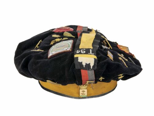 A l’intérieur, toile singalette noire de soutien, cuir noir et bouffette blanche. Pièce de tissu rayé dans le fond. Queue de raton-laveur, détachée de la faluche.
