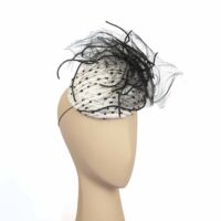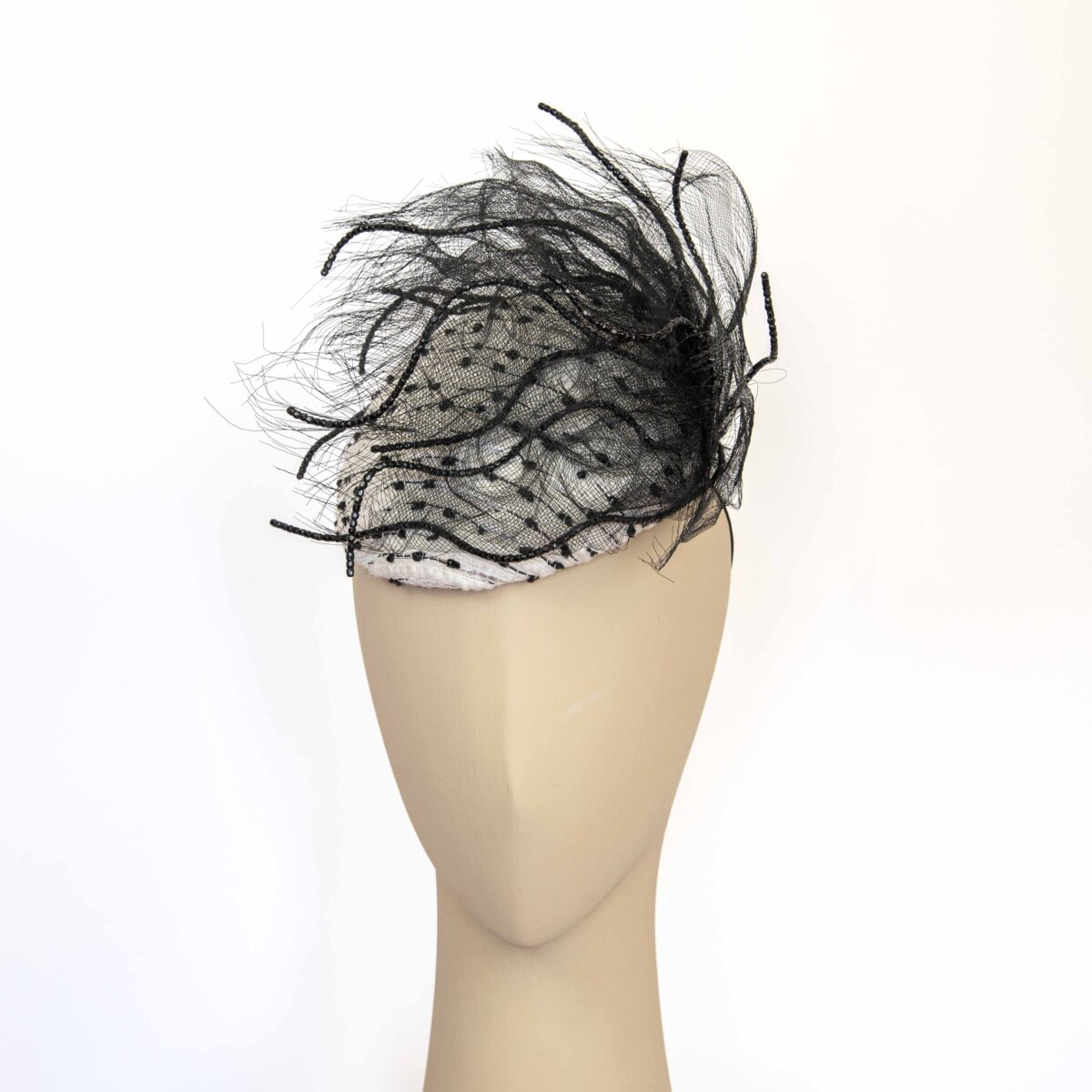 Mini béret fantaisie en tweed écru, blanc et noir, brodé de petites perles noires brillantes, imitation jais.
