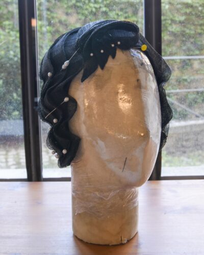 Utilisation créative de la toile de sisal au mètre et de rubans de paille à coudre pour la réalisation d’ornements de tête.